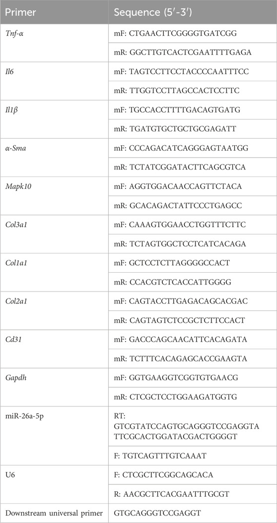 For the expression levels of related genes, Gapdh served as a housekeeping gene. The thermal cycling protocol used for the associated genes reserve transcription involved incubation of the reverse transcription mix at 37 °C for 60 min and 85 °C for 5 s. The RT-qPCR reaction was initiated at 95 °C for 30 s, followed by a total of 40 cycles at 95 °C for 5 s and 60 °C for 30 s, and then a melting step at 95 °C for 15 s, 60 °C for 60 s, and 95 °C for 15 s. Finally, the miR-26a-5p level and the expression of Map2k4, Col1a1, Col2a1, Col3a1, α-Sma, Tnf-α, Il1β, Il6, and Cd31 were analyzed using the 2−ΔΔCT method (Xu et al., 2019).