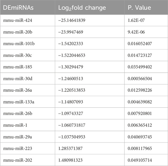 The expression profile of GSE55661 was downloaded from NCBI GEO (http://www.ncbi.nlm.nih.gov/geo/) (Edgar et al., 2002), which contained miRNA expression profile data from 18 mouse skin tissue samples. The tested platform was GPL18386 Luminex Multi-species miRNA array (miRBase 8.0). Then, we selected 6 samples, 2 days after the injury, including 3 samples from the damaged area and 3 normal control skin samples. The limma package version 3.34.7 in R4.3.1 (https://bioconductor.org/packages/release/bioc/html/limma.html) (Ritchie et al., 2015) was used to identify the differentially expressed miRNAs (DEmiRNAs) between the damaged samples and normal control samples based on the thresholds of false discovery rate (FDR) < 0.05 using the Benjamini and Hochberg method and |log2 fold change (FC)| > 1.