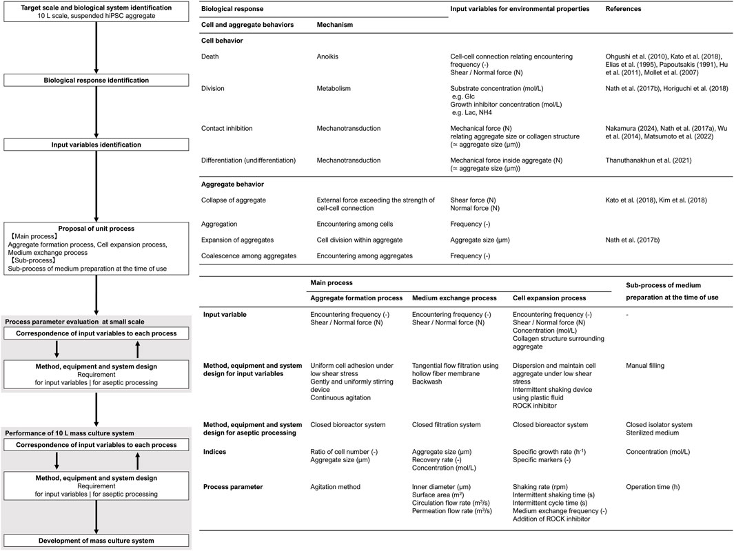 Based on the concept of cell manufacturability, the considerations of mass culture systems for hiPSC aggregates differ from those of conventional anchorage-independent cells. Recent studies require highlight complementary principles for resolving this challenge. For instance, Borys et al. (2024) have emphasized the importance of designing for process robustness, using a framework of process input and output variables to evaluate how a culture system performs over long-term serial passaging. Our study addresses the design and integration of the culture system to enable spatial scale-up to the 10 L level. Our approach guided deconstruction of overall process into distinct unit process and the specific engineering solutions for each unit processes.