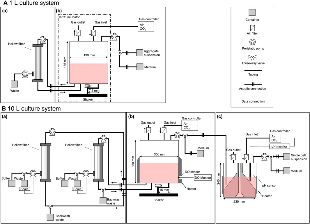 Figure 2. Schematic diagram of (A) 1 L and (B) 10 L mass culture systems for hiPSCs. The mass culture system consisted of (a) a medium exchange process with a tangential flow filtration system using hollow fibers, (b) a cell expansion process with intermittent agitation using a plastic fluid, and (c) an aggregate formation process with a delta paddle stirring device. Each process was aseptically conducted and maintained in a closed environment.