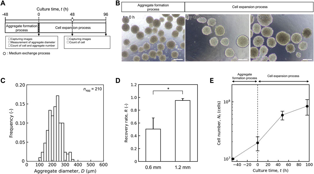 Figure 3. Performance of mass culture system for small scale. (A) Schematic diagram of hiPSC mass culture system for small scale. (B) Representative images of aggregate in aggregate formation and cell expansion process. Scale bars: 200 µm. (C) Distribution of aggregate diameter after aggregate formation process at t = 0 h. Sample size are shown as nagg. (D) Comparison of recovery rate (R) of medium exchange process with inner diameter of 0.6 and 1.2 mm. Error bars represent the standard deviation (n = 3). Statistical significance was determined using Student’s t-test (p < 0.05). (E) Time profile of cell number Nt (cells). Error bars represent the standard deviation (n = 3).