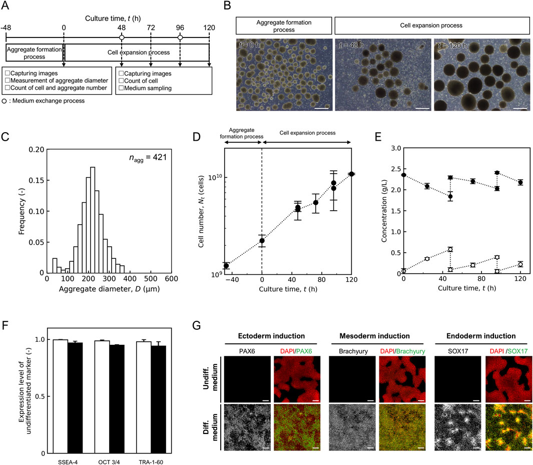 Figure 4. Performance of 10 L mass culture system. (A) Schematic diagram of hiPSC mass culture system. (B) Representative images of aggregate in aggregate formation and cell expansion process. Scale bars: 500 µm. (C) Distribution of aggregate diameter after aggregate formation process at t = 0 h. Sample size are shown as nagg. Time profile of (D) cell number Nt (cells) and (E) concentration of lactic acid (open) and glucose (closed). (F) Flow cytometry analysis to quantify pluripotency marker expression, open, t = −48 h; closed, t = 120 h. (G) Fluorescence staining images of differentiation markers (PAX6, brachyury, and SOX17) expression in cells maintained in undifferentiated medium and differentiation medium. Scale bars, 200 µm. Error bars represent the standard deviation (n = 3).