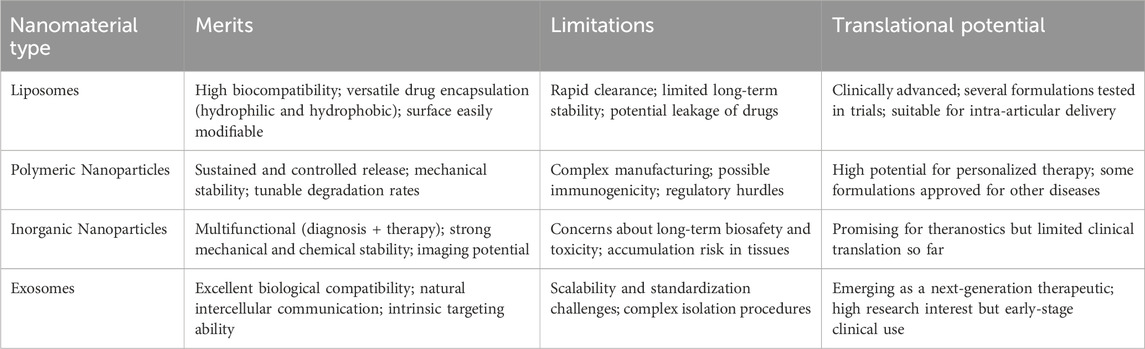 Nevertheless, several technical challenges and limitations must be overcome before nanoparticles can be widely adopted for OA therapy. Liposomes are clinically well-studied but suffer from short circulation times. Polymeric nanoparticles provide superior sustained release but raise manufacturing and regulatory complexity. Inorganic nanoparticles offer multifunctional diagnostic and therapeutic capabilities, yet their long-term biosafety remains uncertain. Exosomes present excellent biological compatibility but face scalability and standardization challenges. These comparisons highlight that no single platform is universally optimal, and the maturity of each approach varies considerably. Key constraints include the scarcity of in vivo studies and the high production costs of NPs (Grayson and Brown, 2025). Additionally, synthetic nanomaterials are susceptible to the complex in vivo microenvironment, often failing to achieve their intended functionality, biocompatibility, and other design objectives (Farjadian et al., 2019). Furthermore, for nanoparticles to become a mainstream clinical treatment for OA, standardized evaluation systems for nanomedicines, clinical treatment guidelines, and regulatory frameworks must be established. Achieving these goals will require extensive, reliable data on safety and efficacy.
