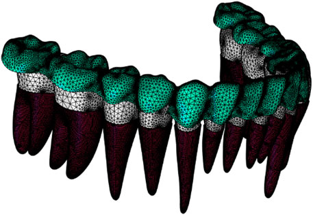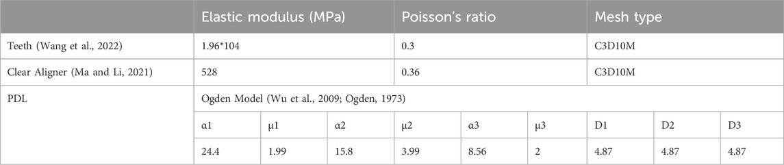 In order to select a suitable material constitutive model of periodontal membrane, a standard mandibular mesial incisor model was used as the research object, and a model containing teeth, periodontal membrane, and simplified alveolar bone was established, and three constitutive models, namely, Linear Elasticity, Ogden Hyperelasticity, and Reduced Polynomial Hyperelasticity, were selected to simulate the mechanical behaviors of the periodontal membrane, respectively, and compared with literature (Yoshida et al., 2001). The data in the center is compared and validated. Refer to Appendix 1 for the specific validation process. The final material properties are set as shown in Table 1 The mesh type is second order tetrahedral cell. In order to determine the optimal number of meshes, the number of 187634, 265622 and 387983 meshes were tried in the process of establishing the mesh, and after trial and error comparison, the number of 265622 meshes was found to be more applicable, based on which, further refinement of the mesh had a very small impact on the results, and the error was negligible. Therefore, after grid-independent analysis, the whole 3D structure is discretized into 265622 meshes. The grid model is shown in Figure 1 (Wang et al., 2022; Ma and Li, 2021; Wu et al., 2009; Ogden, 1973).