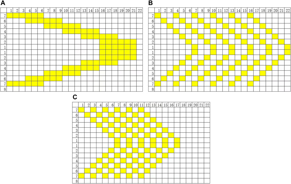 Figure 2. Three sequence methods: Horizontal axis = “Treatment Stages”; Vertical axis = “Tooth Position Number”. (A) V-pattern sequence. (B) ZC sequence. (C) CZC sequence.