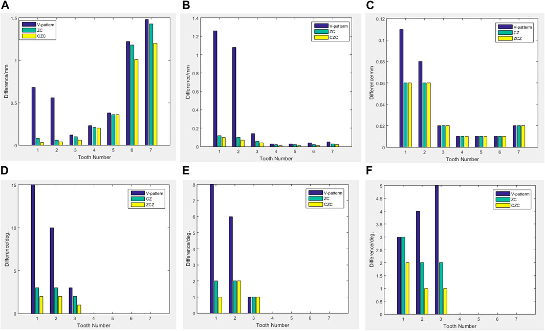 Methods: A standard dental arch model with normal shape was selected, and the same target positions were set. Three different movement sequences were simulated: V-pattern (21stages), ZC (abbreviation of researchers Zhang and Chang; 22 stages), and CZC (an upgraded version of ZC; 17 stages). The final positions of teeth after long-term movement were calculated, and the 3D movements (including translation and rotation) of teeth from their initial positions to the final positions in each sequence were analyzed and compared with the preset target positions.