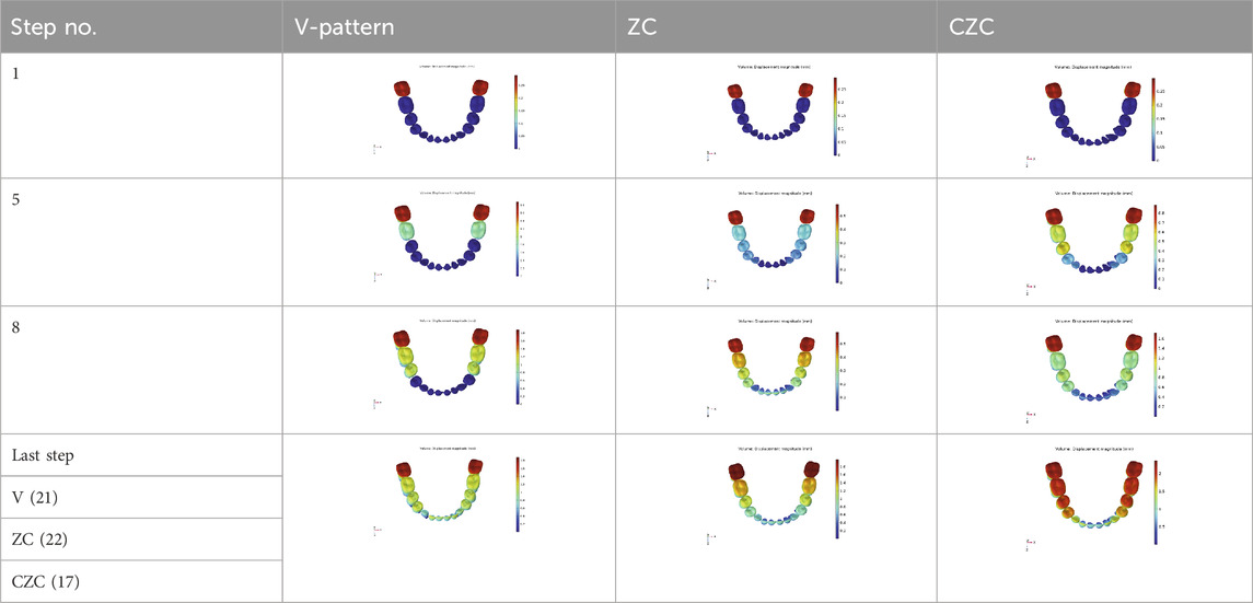 The algorithm for long-term tooth movement in this paper refers to the method in the literature, i.e., in the ideal way, all the initial deformations produced by the PDL are able to be finally reflected as the deformations of long-term movement. Although this method does not reflect the effect of force decay, it can be used as a good analytical tool for comparative studies (Hamanaka et al., 2017). The total amount of movement designed was 3 mm, and the current execution rates were 45.7% for V-pattern, 51.4% for ZC, and 57.1% for CZC. The results of V-pattern and ZC were compared in a previous study, and the results were consistent with the current results, with ZC being superior to V-pattern (Li and Zhang, 2024). According to the data mentioned in clinical reports (Mao et al., 2023; Crego-Ruiz and Jorba-García, 2023), the execution rate of clear aligner orthodontic technology is roughly in the range of 30%–73.8%, and the presently calculated execution rate roughly satisfies the range of execution rate mentioned in clinical reports.