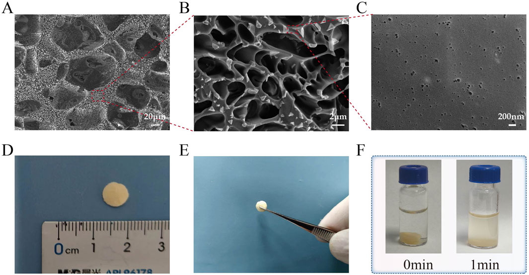 Figure 1. Photos, microscopic morphology, and solubility of the materials. (A–C) The scanning electron microscope (SEM) image of Ly-H-PRF at magnifications of ×300 , 5,000 × , and 30,000; (D) The typical sizes of materials used in applications; (E) Ly-H-PRF can be fully handled or picked up; (F) The solubility of the material in PBS (phosphate-buffered saline).