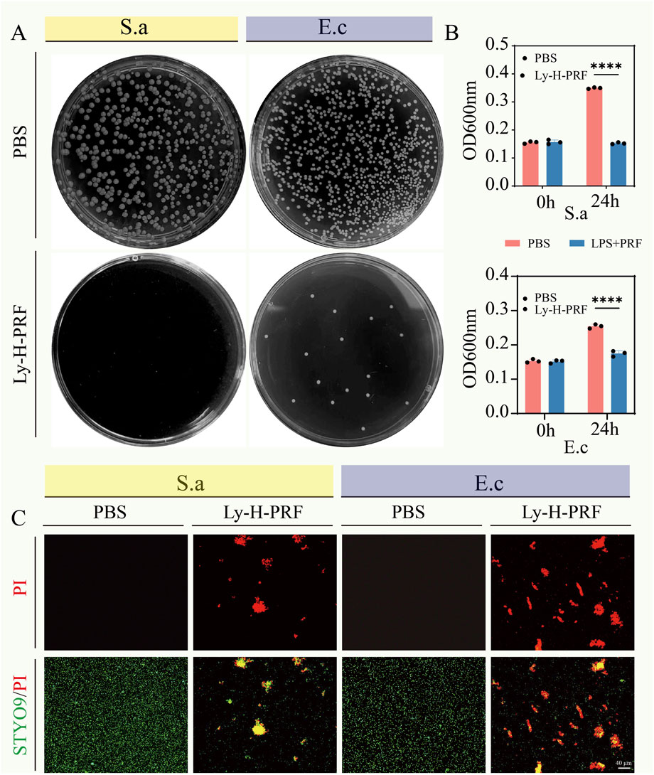 Figure 2. In vitro antibacterial activity of Ly-H-PRF. (A) Representative optical images of colony-forming units for Staphylococcus aureus suspensions and Escherichia coli suspensions treated with or without Ly-H-PRF. (B) Quantitative analysis of OD600 of Staphylococcus aureus and Escherichia coli treated with or without Ly-H-PRF; (C) Fluorescence images show the results of the live/dead staining, with viable bacteria appearing green and dead bacteria appearing red.