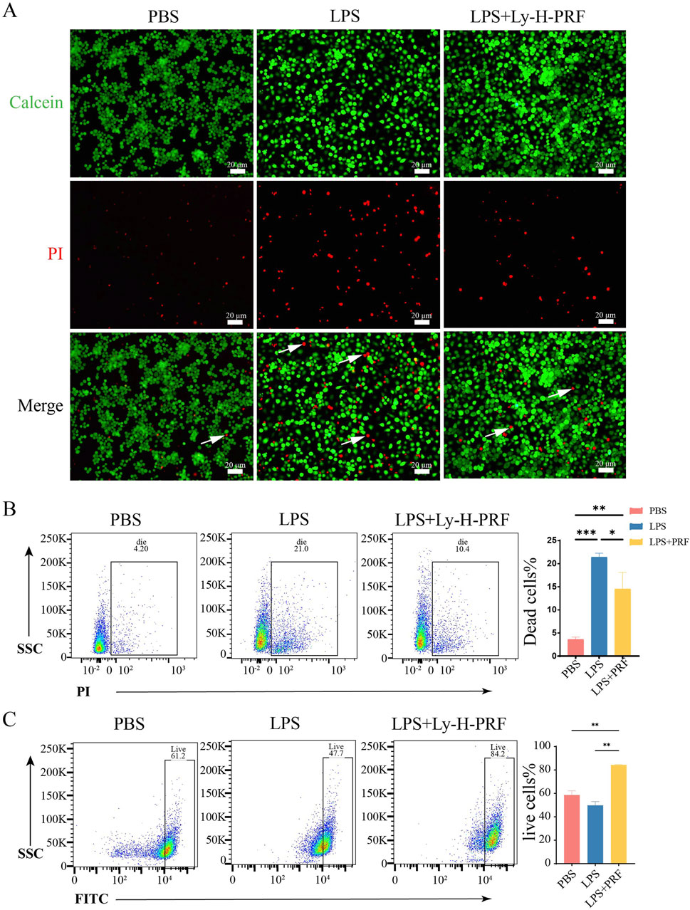 Figure 3. Live/dead assay of RAWs treated with/without LPS and Ly-H-PRF at 24 h. (A) Fluorescence images show the results of the live/dead staining with viable cells appear green and dead cells (white arrow) appear red. Scale bars = 20 μm; (B) Representative images and quantitative analysis of dead cells measured by flow cytometry; (C) Representative images and quantitative analysis of live cells measured by flow cytometry.
