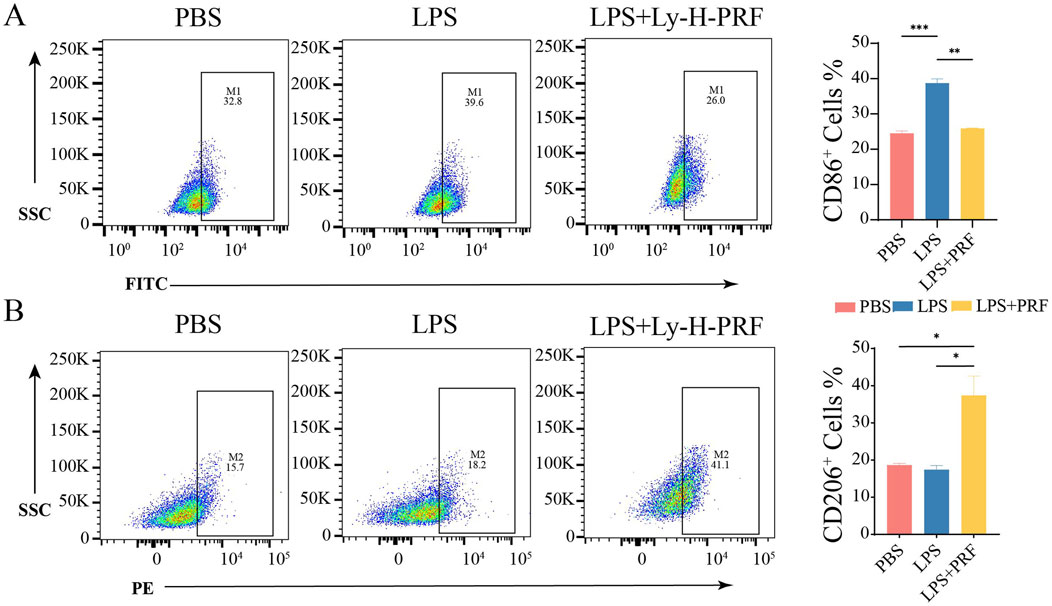 Figure 5. Effect of PRF on polarization of RAW treated with LPS and Ly-H-PRF at 24 h. (A) Representative images and ratio of CD86+ cells measured by flow cytometry. (B) Representative images and ratio of CD206+ cells measured by flow cytometry.