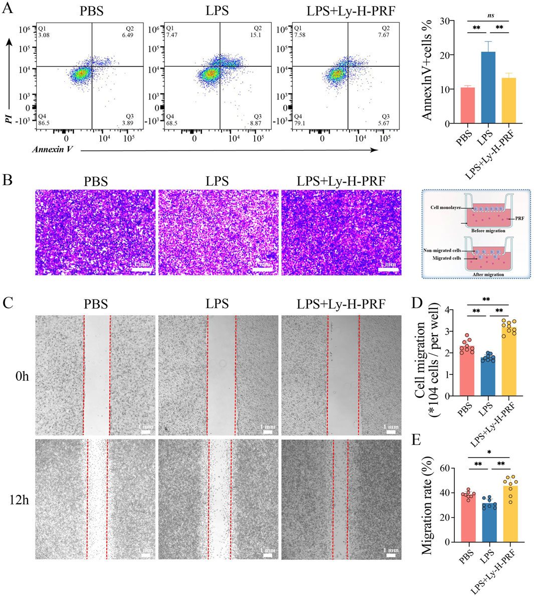Figure 6. Apoptosis and Migration of L929 treated with/without LPS and Ly-H-PRF at 24 h. (A) Representative images and quantitative analysis of apoptosis analysis in L929 cells by flow cytometry. (B,C) Representative images and quantitative analysis of transwell assay in L929 cells (D,E) Representative images and quantitative analysis of scratch assay in L929 cells.
