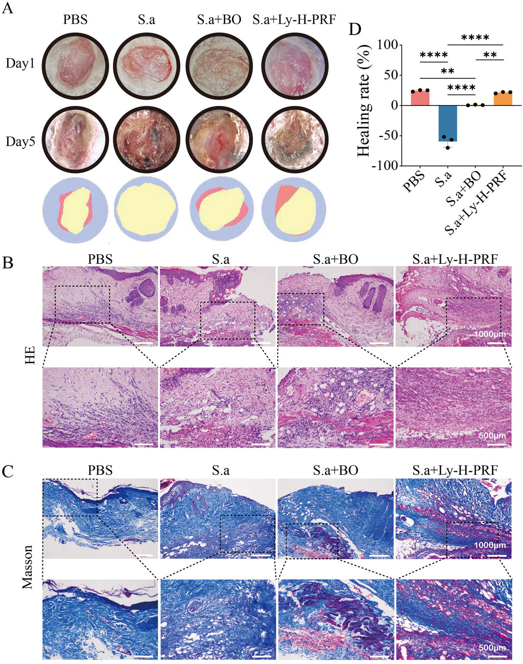 In the PBS group, the burn wounds were covered with sterile gauze soaked in physiological saline and then wrapped with bandages. In the S.a group, sterile gauze cut to the size of the wound was placed on the wound, and then 10 μL of prepared bacterial liquid was dropped onto the gauze before wrapping with bandages. In the S.a+BO group, after applying the bacterial liquid, burn ointment (Jingwanhong, Tianjin, China) was applied to the gauze before wrapping with bandages. In the S.a+ Ly-H-PRF group, after applying the bacterial liquid, 10 μg of PRF lyophilized powder was added to the gauze before wrapping with bandages. After wound formation, the wounds were cleaned with sterile physiological saline every 2 days, disinfected with povidone-iodine, and then new dressings were applied. The healing rate was calculated as follows: Healing rate = ((wound area on day 1) - (wound area on day 5))/(wound area on day 1) × 100%.