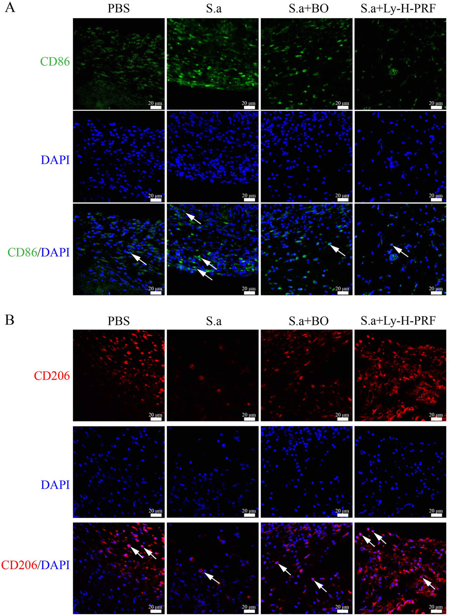 In the mouse infected burn wound model, it was observed that after 5 days of infection in the S.a group, there was a increase in CD86-positive cells in the burn tissue, indicating that infection led to polarization of macrophages towards the M1 phenotype. The number of M1 macrophages in the S.a+BO group was lower than that in the S.a group, and further decreased in the S.a+ Ly-H-PRF group (Figure 8A). On the other hand, M2 macrophages were decreased in the burn tissue of the S.a group, while the number of M2 macrophages in the S.a+BO group was increased compared to the S.a group, and further increased in the S.a+Ly-H-PRF group. This suggests that the use of Ly-H-PRF was able to reduce excessive inflammatory responses and promote soft tissue healing (Figure 8B).