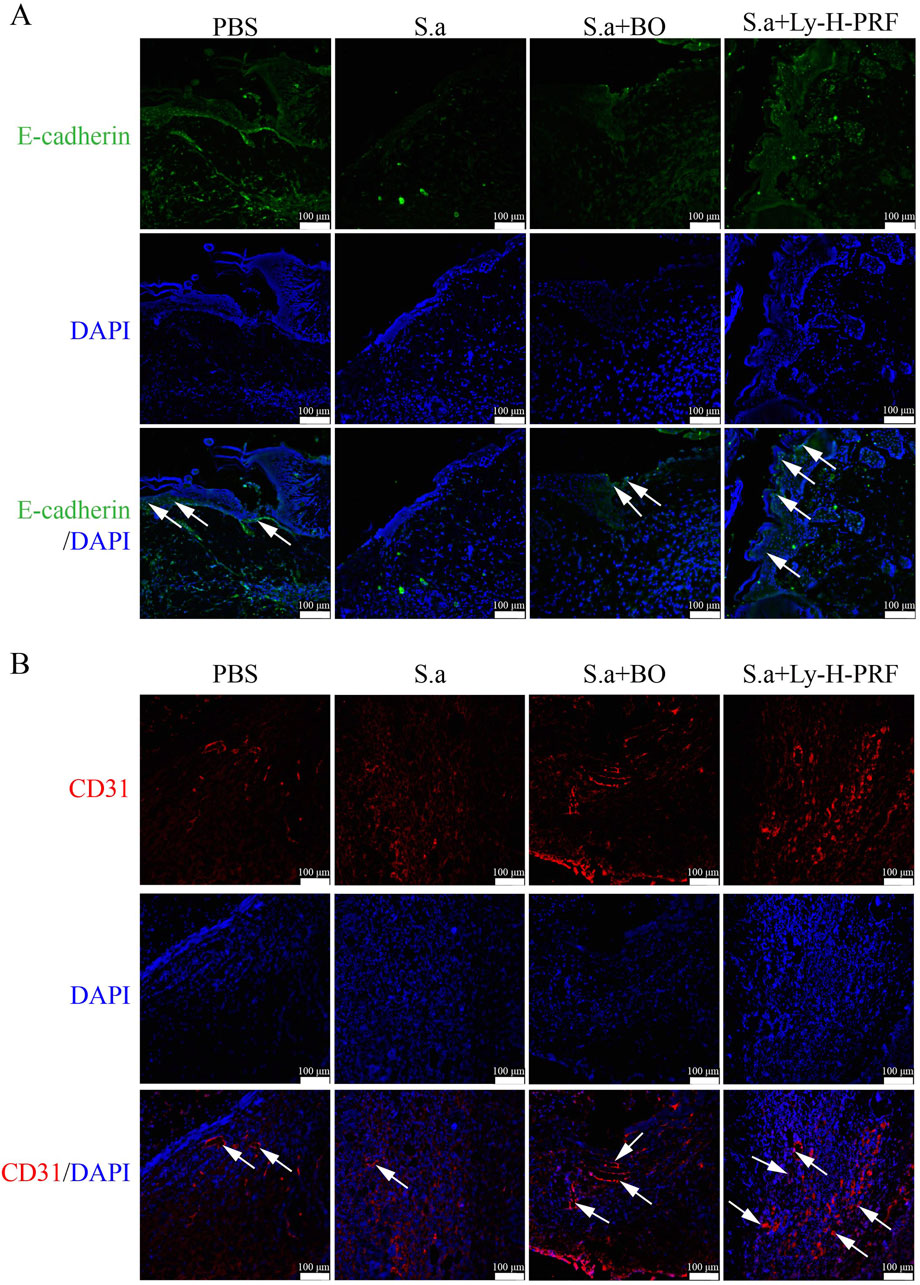 Figure 9. Ly-H-PRF promotes infected burn wound epithelialization and vascular regeneration. (A) Immunofluorescence staining of epithelialization marker E-cadherin in the wound tissue on day 5. Scale bars = 100 μm. (B) Immunofluorescence staining of CD31 in the wound tissue on day 5. Scale bars = 100 μm.