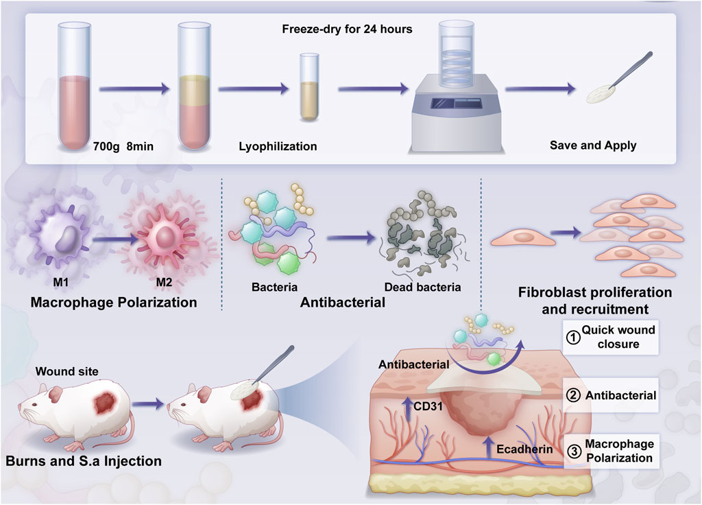 Therefore, the aim of this study was to explore the therapeutic efficacy of a lyophilized H-PRF (Ly-H-PRF) in a co-infected burn model, mainly by exploring its immunomodulatory effecton macrophages through in vitro assays, and its repairing effecton scald wounds through murine infected burn wound models (Scheme 1).
