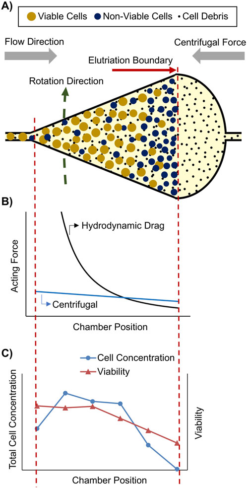 An alternative sorting technology based on cell morphology is cell elutriation using a counter-flow centrifuge, also named fluidized bed centrifuge (FBC). Such systems are able to capture mammalian cells inside a fluidized bed by loading cells in a counter-current mode into a rotating chamber (Figure 1A). The cells are captured at a certain position inside the chamber at which the hydrodynamic drag force equals the counteracting centrifugal force (Figure 1B). This capture position is influenced by chamber dimension, fluid flow rate and viscosity, cell and fluid density, and cell size (Kelly et al., 2016). Due to the pear-shaped chamber dimensions, the flow velocity and thus the hydrodynamic drag force decreases significantly from the chamber inlet to the outlet, whereas the centrifugal force only decreases slightly towards the center of the rotor (Figure 1B). As all physical properties of the media and the monoclonal cells can be assumed constant, except of the cell size, the larger, mostly viable cells are enriched in the tip of the chamber and the smaller, mostly non-viable cells are enriched at the broader chamber outlet, whereas sub μm cell debris pass the elutriation boundary and are washed out of the chamber (Figure 1A).
