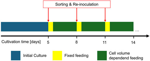 Figure 2. Schematic sequence of the developed continuous fed batch cultivation scenario with media exchange and cell sorting in a cyclic 3-day interval and adapted feed strategy in between.