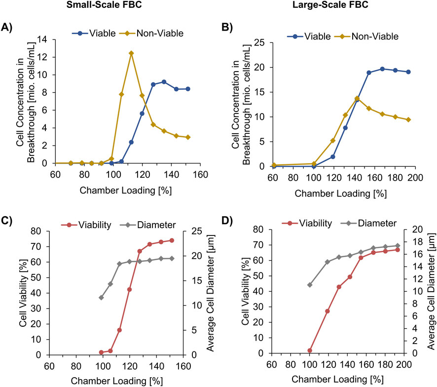Figure 3. Supernatant composition of two different fluidized bed centrifuge (FBC) sizes during the chamber loading. Small-scale FBC loaded with 100 mL/min using a CHO cell broth characterized by a total cell concentration of 13.4 x 106 cells/mL, 76.5% viability, 20.2 μm cell diameter. Large-scale FBC loaded with 800 mL/min using a CHO cell broth characterized by a total cell concentration of 25.9 x 106 cells/mL total, 74.0% viability, 18.5 μm cell diameter. (A,B) Breakthrough of viable and non-viable cells, (C,D) Cell viability and average cell diameter in the collected fractions.