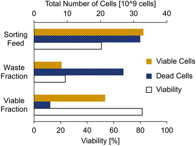 The applied cell sorting approach achieved a significant viability increase from 50.7% in the initial cell broth to 81.4% in the sorted viable cell fraction (Figure 4). Some of the viable cells were found in the waste fraction, due to the high overloading volume. However, most of the viable cells (65%) were recovered in the viable cell fraction and most of the non-viable cells (84%) were removed in the waste fraction. This demonstrated that the sorting approach is suitable for fast processing of large quantities of cells and successfully enriching viable cells in the harvest.