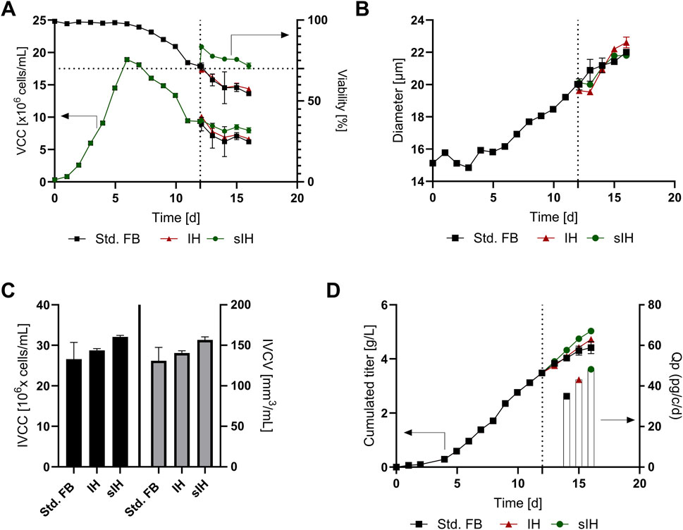 Figure 5. Cellular and product expression characteristics for the impact analysis of cell sorting conducted at the end of a fed-batch (FB) experiment, marked with a dotted line. Subsequent cell culture was split into three approaches: no change (Std. FB), full media exchange by FBC (intermediate harvest, IH) and the new developed sorting approach (sIH). (A) Viable cell concentration (VCC) and cell culture viability; (B) Cell diameter over the course of cultivation; (C) Integral of viable cell concentration (IVCC) and integral of viable cell volume (IVCV); (D) Cumulated titer values over the course of cultivation and cell specific productivities (Qp) for the last 4 days of cultivation.