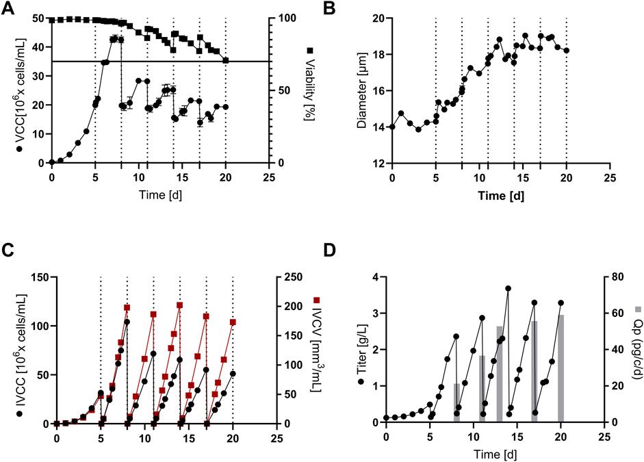 Figure 6. Cultivation and product expression data for the conducted continuous fed-batch (cFB) at re-inoculation density of 20 x 106 cells/mL and 3 days interval of cell sorting: (A) Viable cell concentration (VCC) and cell viability for the process over the 20 days of cultivation; (B) Cell diameter; (C) Integral of viable cell concentration (IVCC) and integral of viable cell volume (IVCV) within the cultivation; (D) Antibody product titer and cellular specific productivity (Qp) for each production interval.