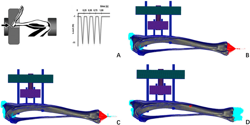 The mesh model file with completed grayscale assignment was imported into the finite element pre-processing software MSC. Patran (version 2019, MSC Software Company, America). Boundary conditions were defined: the proximal tibia was fixed at the tibial plateau with all six degrees of freedom constrained, and a cyclic axial compressive load of 1–11 N was applied to the distal tibial surface. Referencing the axial compression tests on rat tibias conducted by Bettina M. Willie (Willie et al., 2013). This approach has been previously adopted in rodent bone biomechanical studies. Human tibial loads were scaled to rats using body weight and cross-sectional area ratios, an approach validated in prior rodent biomechanics studies.This assumes linear proportionality, a limitation acknowledged in Discussion.
