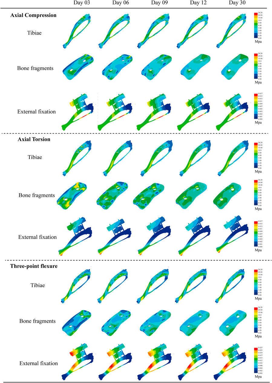 Figure 5. Von Mises equivalent force cloud plots of three biomechanical experiments (axial compression test, axial torsion test, and three-point bending test) performed at different moments (3, 6, 9, 12, and 30days) for each structure after external fixation of rat tibia.