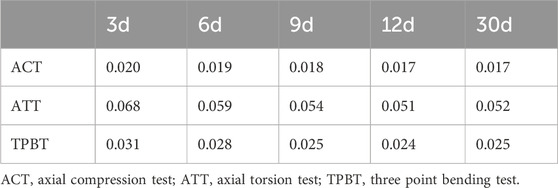 Over a 30-day observation period (3 days–30 days post-surgery), the integration of transported bone fragments with surrounding bone tissue progressively influenced the tibial structural deformation across biomechanical tests. Quantitative measurements revealed time-dependent reductions in deformation: tibial deformation decreased by 15% in the axial compression test (0.020 mm–0.017 mm), 23.5% in the axial torsion test (from 0.068 mm–0.052 mm), and 19.4% in the three-point bending test (from 0.031 mm to 0.025 mm). The most significant reduction in deformation ranges from 13.23% (day6) to 25.00% (day12) in the axial torsion test, comparing to the changes in axial compression and three-point bending. These findings align with the theoretical relationship between deformation (δ) and structural stiffness (k), where δ = F/k—reduced deformation under constant experimental loads implies increased stiffness. The deformation trends indicate that mechanical stability enhancement paralleled morphological healing. (Table 4) (Figure 6D).