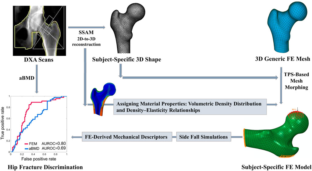 3D-DXA-based FE models have the potential to overcome the limitations of DXA-based 2D FE models (Thevenot et al., 2014; Väänänen et al., 2015; Grassi et al., 2017; Grassi et al., 2021; Wills et al., 2019). Grassi et al. employed statistical shape and appearance models (SSAM) to reconstruct the three-dimensional anatomy of individual femurs from DXA images, subsequently conducting 3D FE simulations (Grassi et al., 2023). The AUROC values computed using bone strength values normalized to the subject’s weight in 10 different side fall configurations revealed significant improvement compared to aBMD + body mass index (BMI) criteria for hip fracture discrimination (Grassi et al., 2023; Grassi et al., 2025). Although most QCT- and 3D-DXA-based FE models improved fracture risk discrimination compared to aBMD, their implementation in clinical practices remains challenging due to high FE simulation cost, lack of automation (Viceconti et al., 2018), or absence of regulatory approval for use in clinical practice (Grassi et al., 2023). Moreover, assessing a robust mechanical criterion that incorporates the effective mechanical parameters associated with femur fracture could enhance the discrimination of hip fractures in a case-control study.