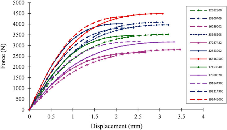 Figure 4 illustrates the force-displacement curves for 3D-DXA-based femur models simulated under side-fall loading, in randomly selected subjects. The curves show that subjects with comparable bone strength could reach different failure points, characterized by varying displacement (D0) and nonlinear energy values.