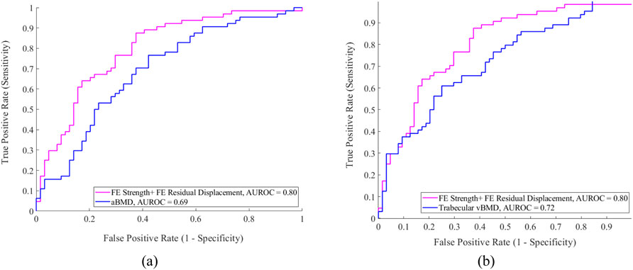 3. Combination of Bone Strength with Mechanical Descriptors: Combining FE strength with corresponding displacement, nonlinear energy, and nonlinear plastic-based descriptors significantly enhanced fracture discrimination compared to BMD-based methods. Notable combinations that significantly over-performed any aBMD-based descriptors included: Strength + Displacement, Strength + Nonlinear Energy, Strength + Nonlinear Deformation, Strength + Residual Displacement, and Strength + Dissipated Energy. Among these, FE strength + Residual Displacement emerged as the most effective combination, achieving a notable improvement in AUROC compared to both aBMD (0.80 vs. 0.69, P = 0.001) and trabecular vBMD (0.80 vs. 0.72, P = 0.016).