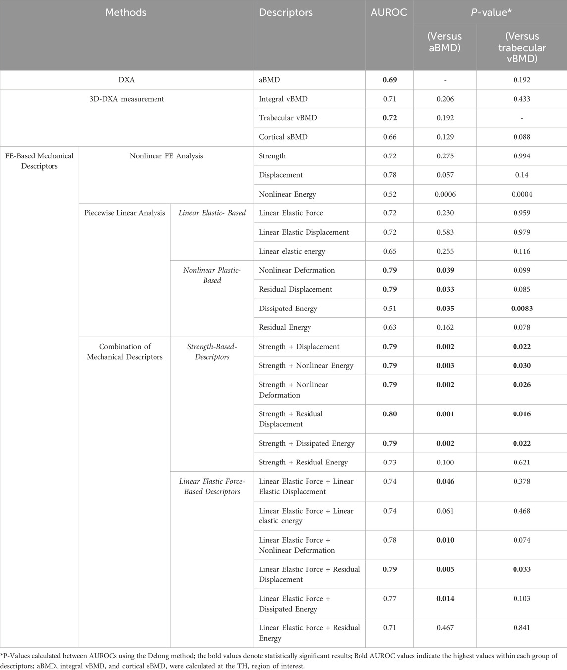 The AUROCs achieved with the FE–based mechanical descriptors were compared to those achieved with aBMD and 3D-DXA measurements, i.e., integral vBMD, trabecular vBMD, and cortical sBMD (Table 4). The FE-based mechanical descriptors were classified into four categories: (i) Nonlinear FE Analysis; (ii) Piecewise Linear Analysis; (iii) Combination of Bone Strength with Mechanical Descriptors; (iv) Combination of Linear Elastic Force with Mechanical Descriptors.