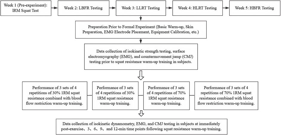 A repeated-measures design was employed, with each participant completing four experimental sessions. One week prior to the formal experiment, a one-repetition maximum (1RM) back squat assessment was conducted according to National Strength and Conditioning Association (NSCA) guidelines (Haff et al., 2021). Subsequent testing sessions were performed with 1-week intervals between sessions, commencing the week after the 1RM assessment. Testing was performed using four distinct warm-up protocols: 1) Low-intensity resistance exercise combined with blood flow restriction (LBFR), 2) Low-intensity resistance exercise training (LLRT), 3) High-intensity resistance exercise training (HLRT), and 4) High-intensity resistance exercise combined with blood flow restriction (HBFR). The order in which each participant completed the four experimental conditions was determined by a computer-generated random sequence, ensuring that all possible orders of the four sessions had an equal chance of occurring. Resistance loads were set at 30% 1RM for the LBFR and LLRT groups and at 70% 1RM for the HLRT and HBFR groups. The resistance warm-up protocol consisted of 3 sets of 4 repetitions of barbell back squats, with a 30-second rest interval between sets. This total volume is sufficient to induce meaningful neuromuscular activation and potentiation while minimizing the fatigue typically associated with higher-repetition schemes (Su et al., 2023). Three spotters were provided during all squatting exercises. The Airbands wireless BFR cuff was applied to the proximal third of the thigh. Arterial occlusion pressure (AOP) was determined using the device’s integrated pressure sensor prior to testing. A compression pressure equivalent to 60% of the individual’s AOP was applied at this location. This specific pressure was selected based on previous literature indicating that it effectively induces metabolic stress, while simultaneously maximizing participant comfort and tolerability (Wei et al., 2019; Brumitt et al., 2020). All experiments were conducted in a climate-controlled laboratory. The ambient temperature was maintained at approximately 23 °C ± 2 °C, and the relative humidity was approximately 50% ± 10%. Behavioral tests were performed during the light phase (between 9:00 a.m. and 5:00 p.m.) to minimize potential circadian influences.