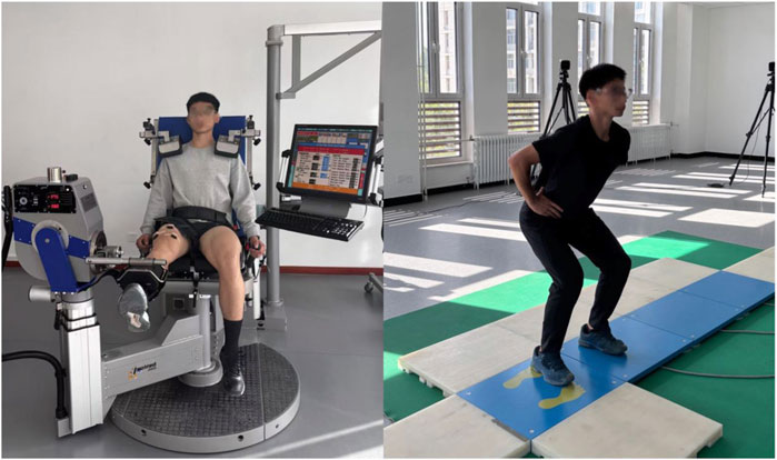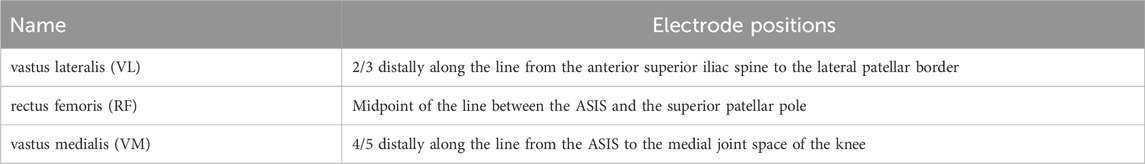 Isokinetic dynamometry quantified dominant-leg knee joint peak torque (limb dominance established through standardized kicking protocol). During testing, subjects maintained seated posture with trunk stabilization, while mechanical restraints immobilized the thigh and ankle segments at predetermined angles. The range of motion (ROM) for the knee joint was individualized for each participant. Testing was performed in seated position using concentric-concentric knee extension-flexion at 180°/s. Participants completed 5 repetitions, with peak torque data from repetitions 2-4 extracted for analysis. Throughout isokinetic testing, synchronized sEMG data were collected from the dominant-leg vastus lateralis (VL), rectus femoris (RF), and vastus medialis (VM) using the Delsys wireless system. Immediately following isokinetic testing, CMJ were performed on a Kistler force platform. Flight height and peak power output during the jump phase were quantified for analysis. During CMJ testing, participants adopted a standardized stance: feet shoulder-width apart with hands fixed on the iliac crests and trunk maintained in vertical alignment. Upon an auditory cue, subjects rapidly descended through combined hip and knee flexion to achieve ∼90° knee angle, followed immediately by maximal vertical propulsion. Two valid trials meeting technical criteria were retained for analysis. EMG signals were processed and analyzed using MATLAB R2019a. Raw data underwent band-pass filtering (4th-order Butterworth, 50-500 Hz cutoff frequencies) (Freitas et al., 2020), followed by full-wave rectification. For each lower-limb muscle during isokinetic testing, the root mean square (RMS) amplitude and median power frequency (MPF) were extracted as primary outcome metrics. EMG signals were normalized in amplitude using the isometric maximum voluntary contraction (MVC). Subjects performed an isometric MVC for the target muscle, and the recorded EMG signal was processed identically to the experimental trials (band-pass filtering, full-wave rectification, and smoothing). The peak value of the resulting envelope was taken as the reference value. Each data point of the envelope signal from the task trials was divided by this peak value and converted to a percentage (%MVC) to obtain normalized amplitude. Three complete effort cycles were selected for feature analysis. The average values of RMS and MPF across the three cycles were computed and used as representative values for subsequent statistical analysis. EMG electrode positions are specified in Table 1. Isokinetic dynamometry testing and CMJ testing procedures are illustrated in Figure 2.