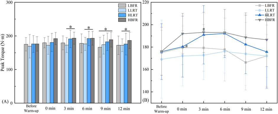 Figure 3. Characteristics of Peak Torque Variation. Note: (A) denotes between-group comparisons, * indicates a significant difference at P < 0.05; (B) denotes within-group comparisons, # indicates a significant difference compared to Pre-Warm-up. LBFR denotes low-intensity resistance exercise combined with blood flow restriction; LLRT denotes low-intensity resistance exercise training; HLRT denotes high-intensity resistance exercise training; HBFR denotes high-intensity resistance exercise combined with blood flow restriction.