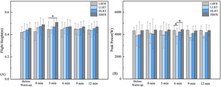 Between-group comparisons (Figure 4A) revealed significant differences: at 3 min in flight height between LBFR and HBFR groups (F = 4.575, P = 0.002, d = −1.105); at 6 min in peak power output between LLRT and both LBFR and HBFR groups (F = 3.069, P = 0.046, P = 0.034, d = −0.895, d = −0.917).