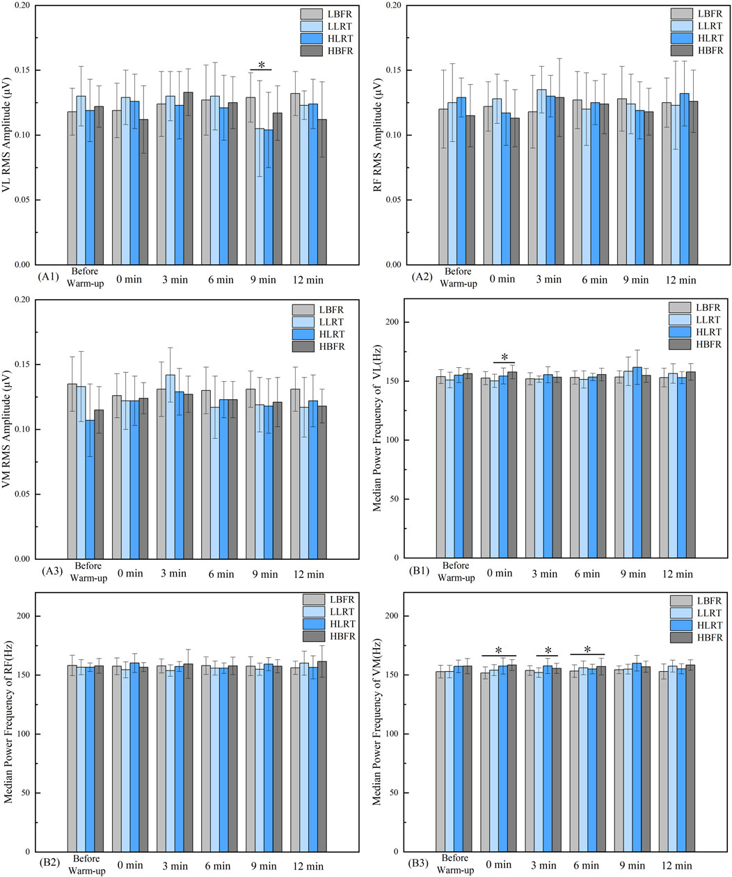 Between-group comparisons revealed a significant difference in vastus lateralis RMS between LBFR and HLRT groups at 9 min (Figure 5A1, F = 1.808, P = 0.035, d = 0.722). At 0 min post-warm-up, significant differences in vastus lateralis MPF were observed between LLRT and HBFR groups (Figure 5B1, F = 6.066, P = 0.031, d = −1.11). At 3 min post-warm-up, vastus medialis MPF differed significantly between LLRT and HBFR groups (Figure 5B3, F = 5.447, P = 0.026, d = −0.843). At 0 min and 6 min post-warm-up, significant differences in vastus medialis MPF emerged between LBFR and HBFR groups (Figure 5B2, F = 5.461, P = 0.000, P = 0.047, d = −1.394, d = −0.615). No significant differences were found in the RMS and MPF of the rectus femoris (Figure 5A2, 5B2; p > 0.05) or in the RMS of the vastus medialis (Figure 5A3; p > 0.05).