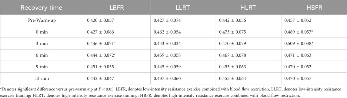 Regarding muscle activation, results demonstrated significantly higher vastus lateralis RMS values in LBFR versus HLRT at 9 min recovery. This finding corroborates previous research indicating that low-intensity exercise combined with BFR achieves comparable or even superior muscle activation levels relative to high-intensity resistance warm-ups (Su et al., 2023). Moreover, it demonstrates that low-intensity resistance training with BFR elicits warm-up benefits equivalent to high-intensity protocols through metabolite accumulation and neuromuscular activation mechanisms. Furthermore, studies suggest that blood flow restriction training likely elicits a local hypoxic-ischemic environment, which may reduce muscle fiber recruitment thresholds. This enables low-intensity resistance training to effectively recruit additional fast-twitch fibers, thereby augmenting force-generating capacity (Song et al., 2023). Our findings provide support for this proposed mechanism. Regarding potentiation effects, only the HBFR group exhibited significantly enhanced post-warm-up muscle activation. This likely stems from increased intramuscular lactate concentration and oxygen debt in the occluded limb (Takarada et al., 2000), which necessitates greater fast-twitch fiber recruitment to compensate for impaired energy supply. In contrast, HLRT lacks the metabolic stimulus of blood flow restriction, failing to effectively recruit additional fast-twitch fibers, as potentially indicated by the decrease in median power frequency (MPF) values. Notably, although group-specific temporal windows were observed for these potentiation effects (e.g., some HBFR metrics changed immediately), peak responses predominantly occurred at 3 and 6 min after the warm-up. All groups demonstrated non-monotonic time-dependent patterns in neuromuscular adaptation, marked by an initial decline, followed by augmentation, and a subsequent reduction—a trajectory consistent with previous studies (Kilduff et al., 2007; Jiang et al., 2025; Li et al., 2023). This result further supports the theoretical model proposed by Lowery et al. (2012), in which no clear PAP is detectable immediately post-warm-up due to fatigue-mediated suppression. As recovery proceeds, however, the neuromuscular system gradually overcomes fatigue, allowing potentiation to become increasingly dominant. Accordingly, significant improvements emerge across various performance metrics—including muscular strength, power output, nerve conduction velocity, and motor coordination. This temporal pattern not only reflects the dynamic balance between fatigue and recovery but also underscores the critical importance of tailored warm-up and recovery strategies within athletic performance optimization.
