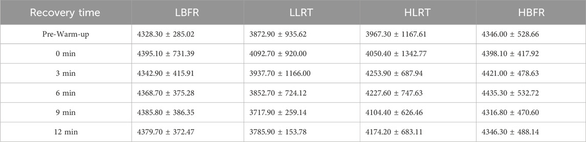 Data computation and statistical analysis in this study were performed using Excel and SPSS 26.0 software. Data visualization was created with Origin 2021 software. The normality distribution and outliers of the data were first examined. Subsequently, one-way repeated measures analysis of variance (ANOVA) was employed for between-group comparisons to examine differences among different warm-up modalities (LBFR, LLRT, HLRT, HBFR). For the jump test data, isokinetic strength data, and sEMG data, Mauchly’s test of sphericity was conducted. If the result met the Huynh - Feldt condition (P > 0.05), the sphericity assumption was accepted, and the results from the univariate ANOVA were used. If the sphericity assumption was violated (P ≤ 0.05), the Greenhouse - Geisser correction was applied. Post-hoc multiple comparisons were performed using the Bonferroni correction. Within-group comparisons were conducted using paired-sample t-tests to analyze the effects of recovery time (0, 3, 6, 9, and 12 min) on jump performance, isokinetic strength data, and surface electromyography data. Data are presented as mean ± standard deviation (M ± SD), with statistical significance set at P < 0.05.