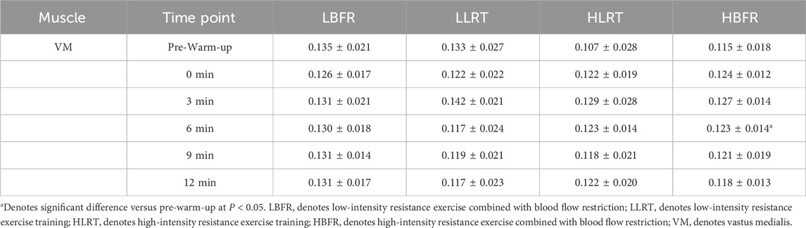 Within-group analysis (Table 4) demonstrated significantly greater vastus medialis RMS values at 6 min post-warm-up versus pre-warm-up in the HBFR group (t = −2.488, P = 0.032, d = 0.5).