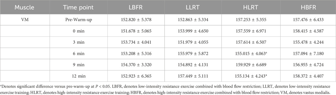 The HLRT group demonstrated significantly lower vastus medialis MPF values at 6 min (t = 2.792, P = 0.019, d = −0.471) and 12 min (t = 2.284, P = 0.045, d = −0.439) post-warm-up compared to pre-warm-up (Table 5).