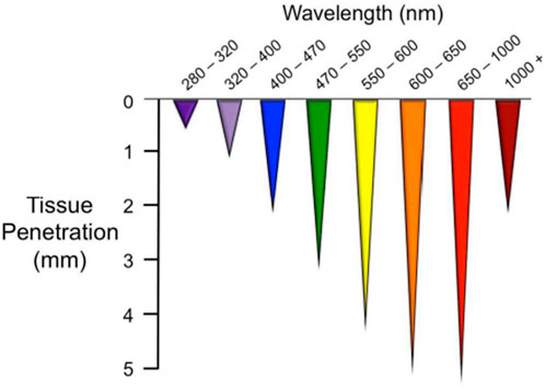 Light initiates essential physiological processes vital for human health. It consists of three main spectral regions within the electromagnetic radiation emanating from the sun that reaches Earth: ultraviolet (UV) light, visible light (VL), and infrared light (Sklar et al., 2013). There is increasing evidence that certain wavelengths of electromagnetic radiation, ranging from VL to the near infrared (NIR), have the potential to elicit photophysical and photochemical effects capable of modulating biological processes in human body (Serrage et al., 2019). The efficacy of these outcomes is primarily influenced by the depth of penetration of the utilized wavelength, and these effects may differ based on the specific location of the tissue (Lanzafame, 2020; Chauhan and Gretz, 2021). In general, the longer the wavelength, the greater the penetration depth. In addition, the cellular response may vary depending on the different irradiation parameters. PBM can have extensive effects on a variety of chromophores such as signaling molecules containing flavins and porphyrins, as well as elements of the electron transport chain depending on the wavelength of the light (Serrage et al., 2019; da Silva et al., 2023). Colors are frequently used to denote specific wavelength ranges, such as blue (400–470 nm), green (470–550 nm), yellow (570–595 nm), red (630–700 nm) and NIR light (700–1200 nm) (Barolet, 2008; Ruggiero et al., 2016; Chauhan and Gretz, 2021) which have different penetration depths (Figure 1). Blue light can penetrate as far as 0.07–1 mm (Kumari et al., 2023) in the body and is known for its positive impact on wound healing (Purbhoo-Makan et al., 2022), acne (Diogo et al., 2021; Nakayama et al., 2023) and psoriasis (Pieper et al., 2022). However, it is also associated with adverse effects, such as causing cellular damage through the excessive production of reactive oxygen species (ROS) (Yang et al., 2017; Kumari et al., 2023). Notwithstanding this, there are some studies showing that this increased ROS generation can trigger apoptosis of tumor cells, making blue light irradiation an optimal candidate for an alternative therapy due to its potential anti-tumor effect (Balas et al., 2023; Takeuchi et al., 2023).