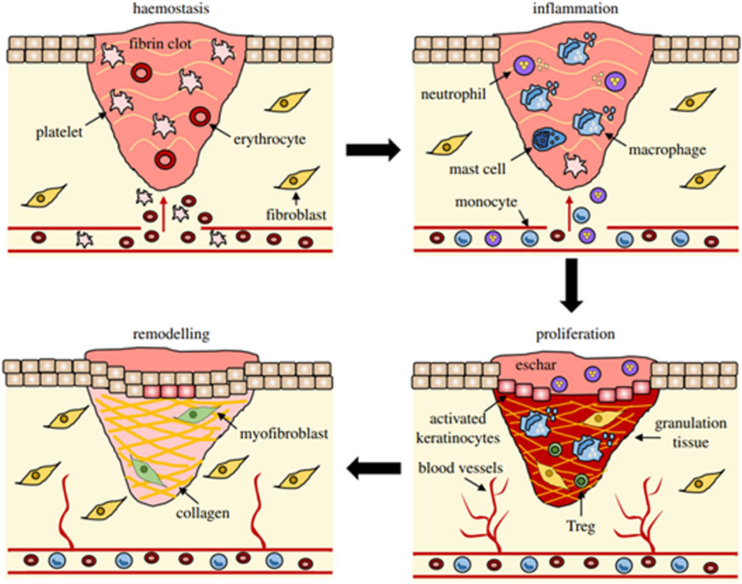 Figure 2. Overview of wound healing stages and their principal cellular elements (Wilkinson and Hardman, 2023).