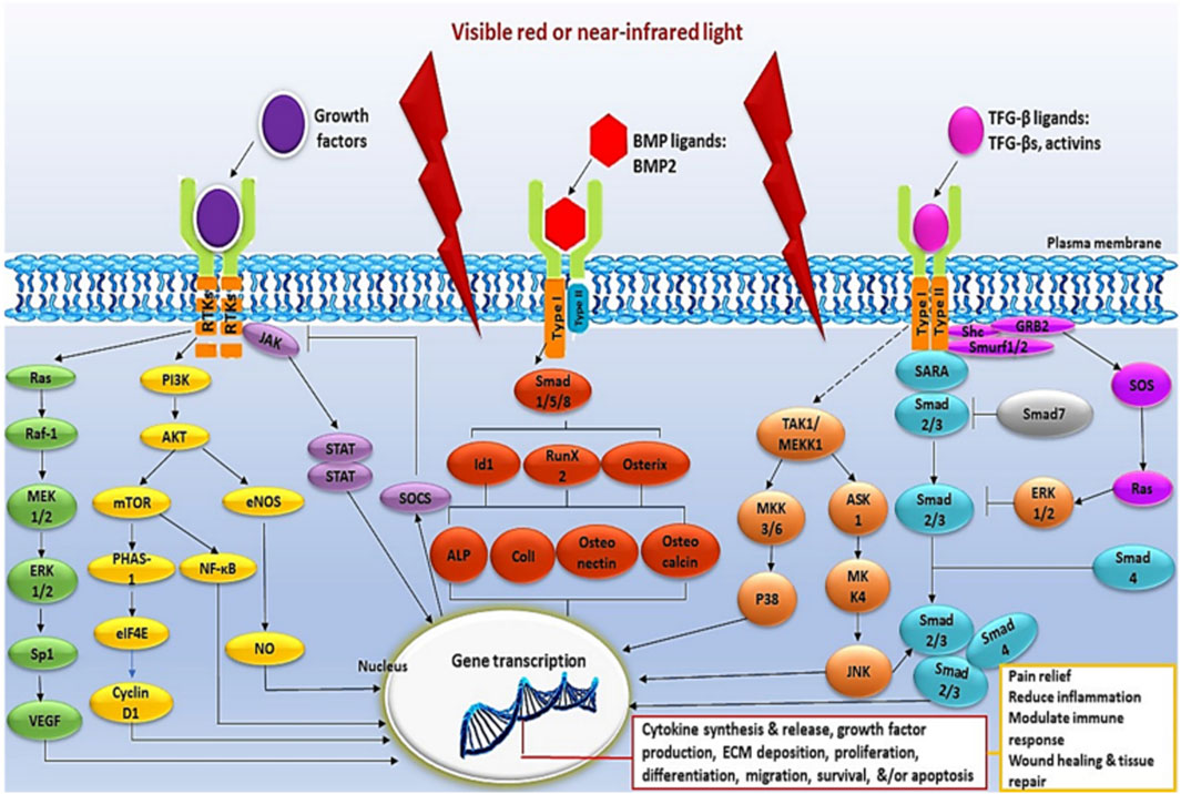 Diagram illustrating signal transduction pathways involving growth factors, BMP ligands, and TGF-beta ligands across a plasma membrane. Arrows indicate interactions leading to Smad transcription in the nucleus, affecting cytokine synthesis, gene factors, and inflammatory responses. Pathways show interactions involving proteins such as Ras, PI3K, Smad, ERK, and others, leading to processes like pain relief and tissue repair upon stimulation by visible or near-infrared light. Different colored shapes represent various proteins and signaling components.