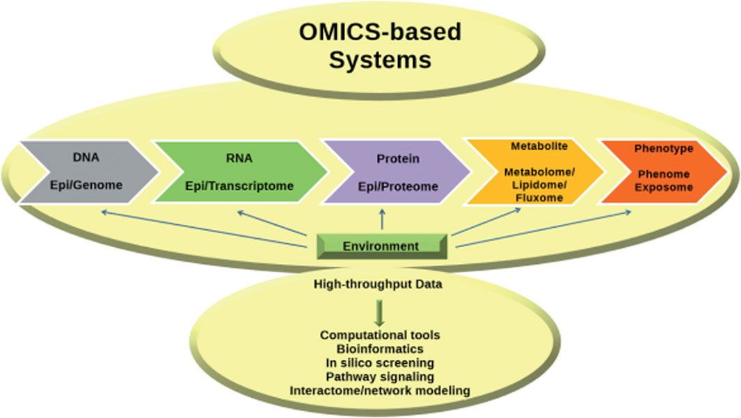 OMICS-based systems diagram illustrating five stages: DNA (Epi/Genome), RNA (Epi/Transcriptome), Protein (Epi/Proteome), Metabolite (Metabolome/Lipidome/Fluxome), and Phenotype (Phenome/Exposome). Arrows indicate interactions with the environment and highlight high-throughput data processing using computational tools, bioinformatics, in silico screening, pathway signaling, and interactome/network modeling.