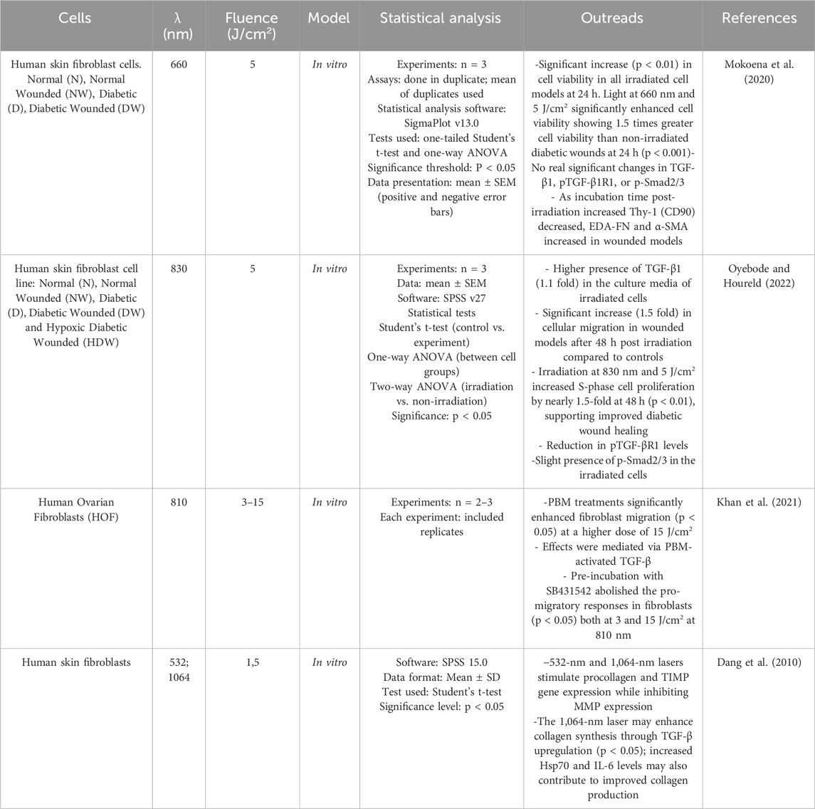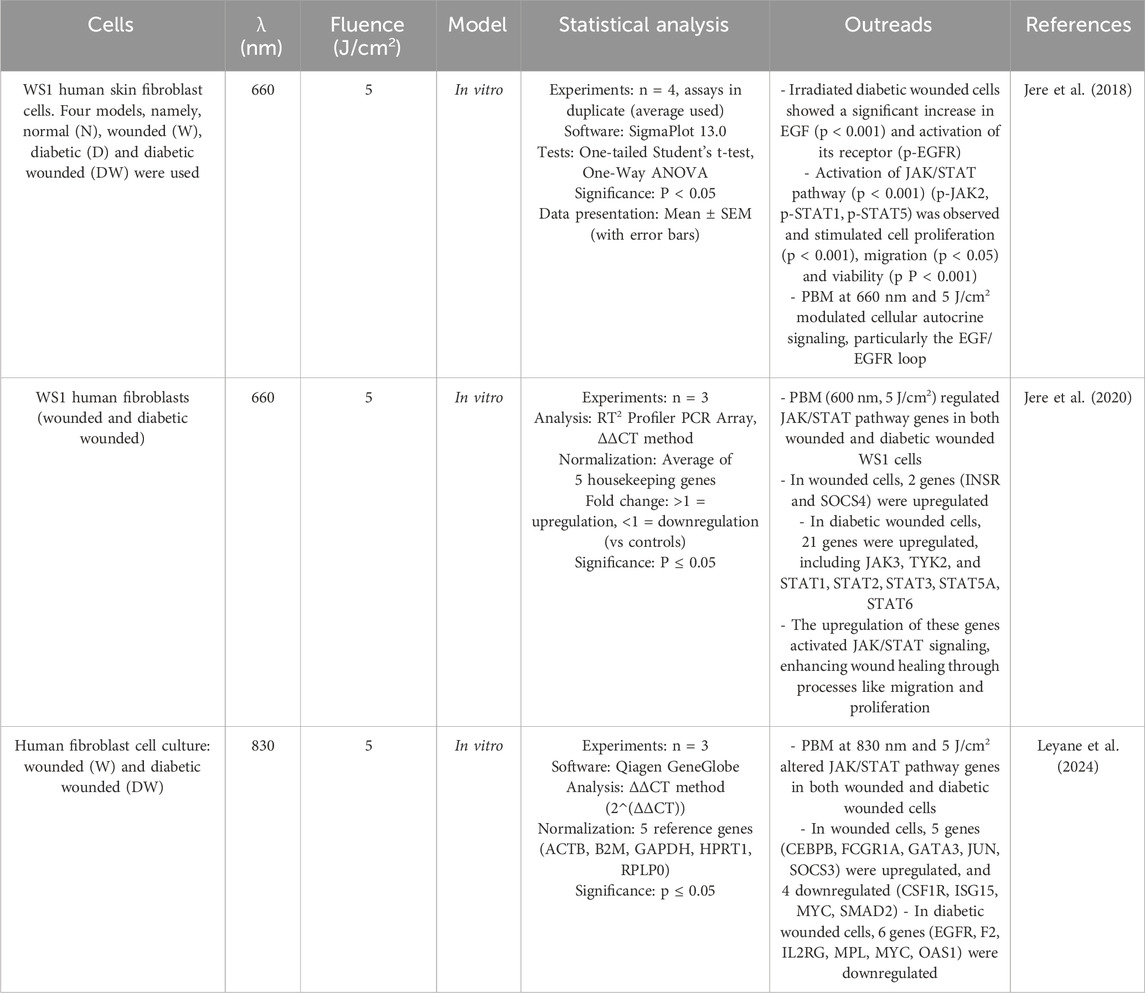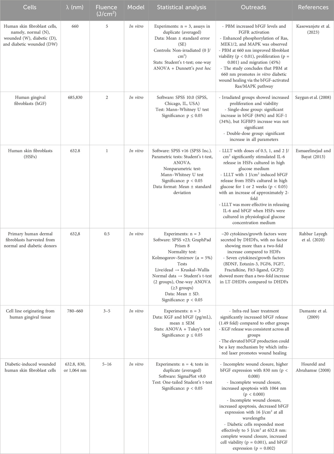 Delayed wound healing is linked to impaired cell function, which leads to reduced migration, proliferation and synthesis of growth factors and collagen. Growth factors, including members of the fibroblast growth factor (FGF) family, play a critical role in the regulation of wound healing. FGF is involved in signal transduction pathways such as Ras/MAPK, phospholipase C (PLC), signal transducer and activator of transcription (STAT) and protein kinase B (AKT). The Ras/MAPK pathway, a well-characterized signal transduction pathway, transmits extracellular signals to the nucleus to activate genes for cell growth, division and differentiation to promote wound healing (Kasowanjete et al., 2022). Kasowanjete et al. (2023) found that irradiating diabetic wounded cells in vitro with PBM at 660 nm and 5 J/cm2 enhanced cell viability and proliferation. Additionally, irradiated diabetic wounded cell models showed a significant increase in migration rate-almost 3.5 folds (45%)- 24 h post-irradiation. This was determined by measuring the distance between the wound edges and calculating the percentage of cell migration. The improvement was attributed to increased levels of basic fibroblast growth factor (bFGF) and the subsequent activation of the Ras/MAPK signaling pathway (Kasowanjete et al., 2023). Various studies indicate that PBM accelerates wound healing by stimulating fibroblast proliferation. Saygun et al. (2008) discovered that PBM at 685 nm and 830 nm statistically significantly increased the production of growth factors such as bFGF by 6.3-fold (84%) and insulin-like growth factor-1 (IGF-1) by 1.5 fold (34%) compared to the control group in human gingival fibroblasts (hGF) without causing cell damage (cell viability was 109%). They compared the effects of a single and a double dose of laser irradiation (2 J/cm2) and observed increased fibroblast proliferation in both groups compared to the control group (Saygun et al., 2008). Furthermore, PBM was shown to have greater efficacy when human skin fibroblasts (HSF) were cultured under high glucose conditions during laser treatment. Esmaeelinejad and Bayat (2013) found that PBM at 632.8 nm and 1 J/cm2 stimulated the release of bFGF from HSF that were initially cultured in high glucose media for one or 2 weeks and transitioned to physiological levels during laser treatment with an increase of approximately 2-fold. This study emphasises the importance of maintaining glycemic control during laser treatment for HSF initially cultured under high glucose conditions (Esmaeelinejad and Bayat, 2013). Rahbar Layegh et al. (2020) investigated the effects of PBM on primary human dermal fibroblasts derived from both normal (HDFs) and diabetic (DHDFs) donors. Irradiation at 632.8 nm and 0.5 J/cm2 was used to treat diabetic fibroblasts (LT-DHDFs). The analysis revealed that LT-DHDFs exhibited significantly increased secretion of key proteins involved in various cellular processes important for wound healing, including proliferation, migration and inflammatory response. In particular, seven cytokines/growth factors, including BDNF, eotaxin-3 (CCL26), FGF6, FGF7 (KGF), fractalkines (CX3CL1), Fit3 ligand (FT3LG) and GCP2 (CXCL6), showed a more than a two-fold increase in secretion in LT-DHDFs compared to untreated DHDFs, highlighting the potential of PBM to improve cell function impaired by diabetes. Not only is this therapy promising in alleviating the cellular deficits associated with diabetes, but it also underscores its role in promoting wound healing by modulating critical signal transduction pathways (Rahbar Layegh et al., 2020). Damante et al. (2009) observed that human gingival fibroblasts, when exposed to infrared laser at 780 nm with doses of 3 J/cm2 and 5 J/cm2, exhibited a 1.49-fold increase in bFGF release compared to non-irradiated cells (Damante et al., 2009). There are different opinions as to which wavelength is best suited to achieve positive effects on diabetic fibroblasts. Houreld and Abrahamse (2008) investigated the optimal laser parameters for the healing of diabetic wounds in vitro. Fibroblast cells were irradiated with 5 or 16 J/cm2 at 632.8 nm, 830 nm or 1,064 nm. The results showed that irradiation with 5 J/cm2 at 632.8 nm led to complete wound closure, increased cell viability and enhanced bFGF expression compared to diabetic wounded un-irradiated cells. At 830 nm, partial closure and increased bFGF expression were observed, while at 1,064 nm, incomplete closure with increased apoptosis was observed. Higher doses (16 J/cm2) at each wavelength resulted in incomplete occlusion, increased apoptosis and reduced bFGF expression. These results emphasise the wavelength- and dose-dependent responses of diabetically injured cells to laser therapy, with the best results obtained at 5 J/cm2 and 632.8 nm (Houreld and Abrahamse, 2008) (Table 1).