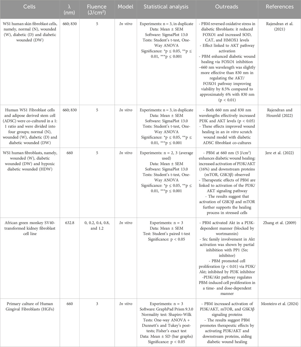 The phosphoinositide 3-kinase (PI3K)/protein kinase B (AKT) signaling pathway is an important intracellular signaling pathway involved in the regulation of various cellular processes such as growth, proliferation, survival, and metabolism. PI3K catalyzes the phosphorylation of phosphoinositides in the cell membrane in response to extracellular signals such as growth factors or insulin. Upon activation, PI3K produces phosphatidylinositol-3,4,5-trisphosphate (PIP3), which recruits AKT to the cell membrane, which is activated by phosphorylation at residues Thr308 and Ser473 (Manning and Cantley, 2007). Oxidative stress induced by high glucose blocks the AKT pathway, and in diabetics, downregulation of the PI3K/AKT pathway is widespread and leads to poor wound healing and tissue regeneration (Rajendran et al., 2021). Transcription factors, including the Forkhead family of transcription factors class ‘O' (FOXO), play a role in orchestrating events critical for normal wound healing. FOXO1, a member of the FOXO subgroup, regulates the insulin/PI3K/AKT signaling pathway and is implicated in wound healing, although its specific role in this process remains incompletely understood (Rajendran et al., 2019). PBM treatment with light of 660 and 830 nm (5 J/cm2) reversed the increased oxidative stress in diabetic and diabetic-wounded fibroblast cells by decreasing FOXO1 levels and increasing the concentration of the enzymatic antioxidants superoxide dismutase (SOD), catalase (CAT) and heme oxygenase (HMOX1), probably via activation of the AKT signaling pathway. Under high glucose conditions, PBM enhanced cell viability and migration by increasing AKT and antioxidant levels while reducing FOXO1 expression, with 660 nm being slightly more effective than 830 nm in modulating the AKT/FOXO1 pathway—improving viability by 8.5% compared to approximately 6% with 830 nm (Rajendran et al., 2021). The same group investigated a novel mechanism of PBM at 660 and 830 nm on human WS1 fibroblast and adipose-derived stem cell (ADSC) co-cultures. In the study, the samples were divided into four groups: normal (N), wounded (W), diabetic (D), and diabetic wounded (DW). At a dose of 5 J/cm2, both wavelengths effectively increased PI3K and AKT levels, improving wound healing in an in vitro scratch wound model with diabetic ADSC fibroblast co-cultures (Rajendran and Houreld, 2022). Another study confirmed that a wavelength of 660 nm (5 J/cm2) enhances therapeutic activities in diabetic wound healing by activating the PI3K/AKT signaling pathway with an increase of approximately 16% and stimulating downstream signaling proteins (mTOR, GSK3β) in fibroblast cells in vitro (Jere et al., 2022). Zhang et al. (2009) demonstrated that PBM promotes cell proliferation via the PI3K/Akt signaling pathway by testing irradiation with 632.8 nm at different fluences (0.2, 0.4, 0.8 and 1.2 J/cm2) on african green monkey SV40-transformed kidney fibroblast cell line (COS-7). They found that PBM significantly enhanced cell proliferation in a dose-dependent manner, with 1.2 J/cm2 being the optimal dose. PBM induced continuous Akt activation, which was completely inhibited by wortmannin, a PI3K inhibitor, suggesting that the effect of PBM on Akt activation is PI3K-dependent (Zhang et al., 2009). A recent work conducted by Monteiro et al. (2024) demonstrated that was possible to observe a higher relative expression of PI3K-pathway and differentiation after PBM (660 nm, 3 j/cm2) (Table 4).