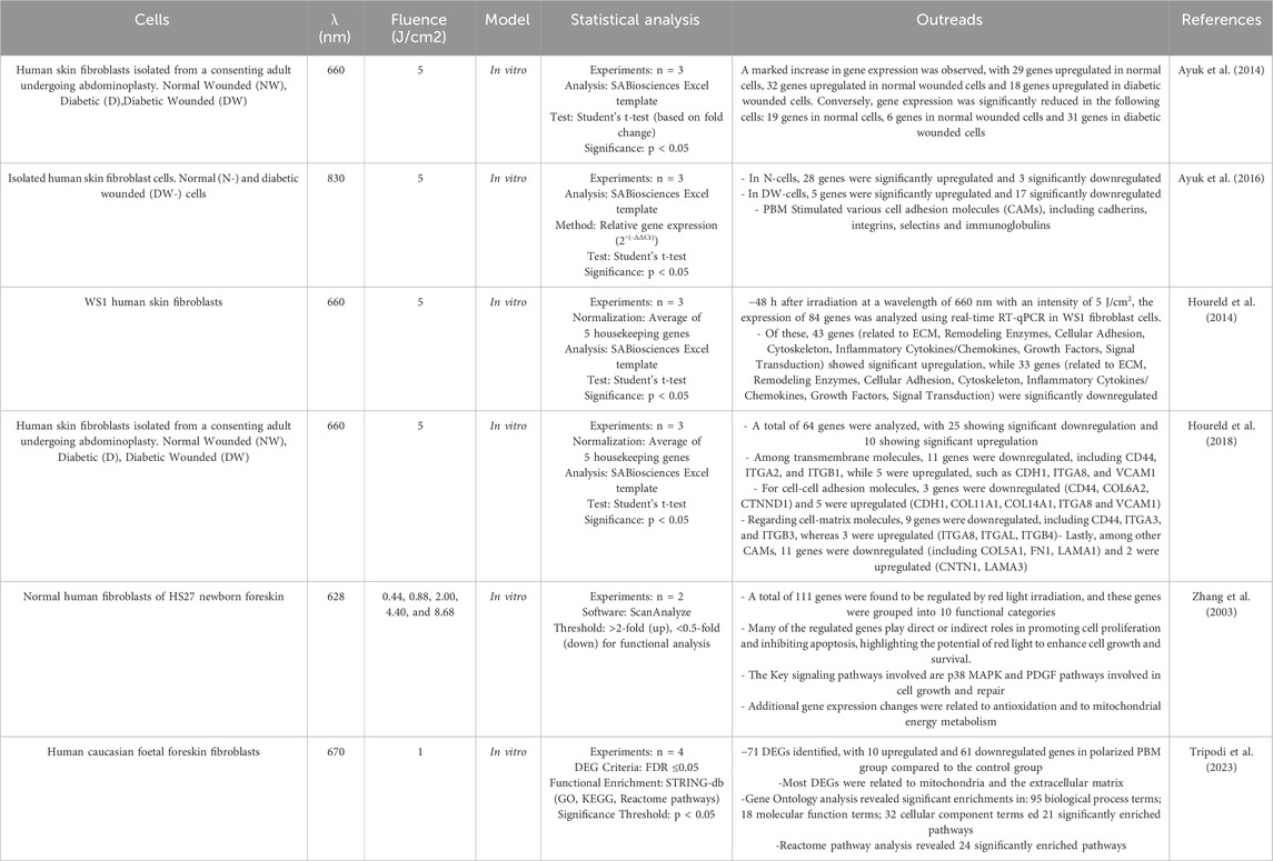 Transcriptomic analyses can reveal changes in mRNA levels in fibroblasts after PBM treatment (Table 5). This helps to understand how PBM regulates gene expression at the transcriptional level and can reveal specific signaling pathways that are activated by PBM (Ayuk et al., 2014; Houreld et al., 2014; Ayuk et al., 2016). In a study conducted by Houreld et al. (2018) the effect of PBM on cell adhesion molecules (CAMs) in diabetic wound healing was investigated using human skin fibroblasts in a diabetic wound model. A diode laser at 660 nm with a fluence of 5 J/cm2 was used, and cells were analyzed 48 h after irradiation. RT2 Profiler PCR Array showed that PBM modulated the expression of 64 CAM-related genes, with 10 genes upregulated and 25 downregulated. These genes were associated with transmembrane molecules (11 genes (including CD44, ITGA2, and ITGB1) were downregulated, while 5 (such as CDH1, ITGA8, and VCAM1) were upregulated), cell-cell adhesion (CD44, COL6A2, CTNND1 were downregulated and 5 (CDH1, COL11A1, COL14A1, ITGA8 and VCAM1) were upregulated) and cell-matrix adhesion (9 genes were downregulated, including CD44, ITGA3, and ITGB3, whereas 3 (ITGA8, ITGAL, ITGB4) were upregulated. Even more, among other CAMs, 11 genes were downregulated (including COL5A1, FN1, LAMA1) and CNTN1, LAMA3 were upregulated). PBM at 660 nm altered CAM gene expression and improved healing, indicating its potential benefit in combination with other therapies to treat diabetic wounds (Houreld et al., 2018). Zhang et al. (2003) used a cDNA microarray technique to investigate the gene expression profiles of human fibroblasts HS27 irradiated with low-intensity red light (628 nm) at an optimal dose of 0.88 J/cm2. They found that irradiation can affect the expression of 111 genes belonging to different 10 functional categories, seven of which are directly or indirectly involved in cell proliferation (Zhang et al., 2003). RNA sequencing (RNA-seq) is a powerful technique used to analyze the transcriptome, the complete set of RNA transcripts produced by the genome under specific circumstances or in a specific cell in order, for example, to quantify the levels of mRNA in a sample, allowing researchers to determine which genes are active, their expression levels, and how they change under different conditions. Tripodi et al., 2023 evaluate transcriptomic changes in human Caucasian fetal foreskin fibroblasts (HFFF2) treated with 0.5 μM hydrogen peroxide (H2O2) to induce oxidative stress in response to polarized PBM at 670 nm at 1/cm2 by RNA seq. A total of 71 differentially expressed genes (DEGs) were described. All DEGs were found in the polarized PBM treated group compared to the control group. The study has shown that PBM has a strong impact on several areas of mitochondrial energy production and signaling pathways associated with wound healing, which opens up many possibilities for further research (Tripodi et al., 2023).