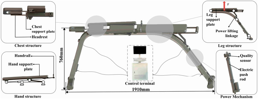 As shown in Figure 2. Arch bridge shaped square steel base, two sets of electric linear push rods and chest/leg support components; The support force can be adjusted to reduce the lumbar spine load and achieve individualized adaptation without changing the training intention; Supporting mechanical limit and dual channel emergency stop.